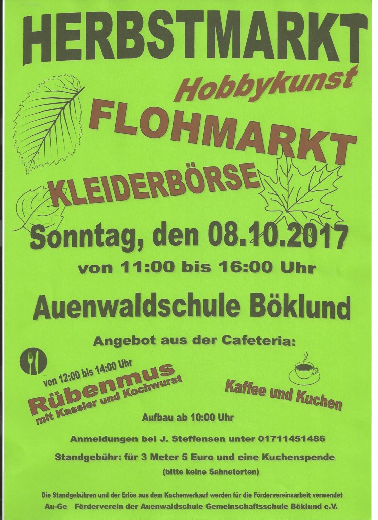 Am Sonntag, den 8.10. 2017  wird von 11:00 bis 16:00 Uhr   in der Schule ein Herbstmarkt veranstaltet – mit Hobbykunst, Flohmarkt und  Kleiderbörse .