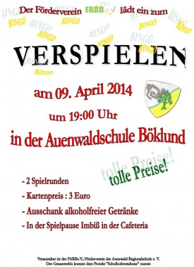 Der Förderverein der Auenwaldschule – Regionalschule Böklund e.V. lädt alle Eltern und Erziehungsberechtigten sowie deren Verwandte, Freunde, Nachbarn usw. recht herzlich zum Bingo -Abend am 09.April 2014 um 19:00 Uhr in den Mehrzweckraum der Schule ein.