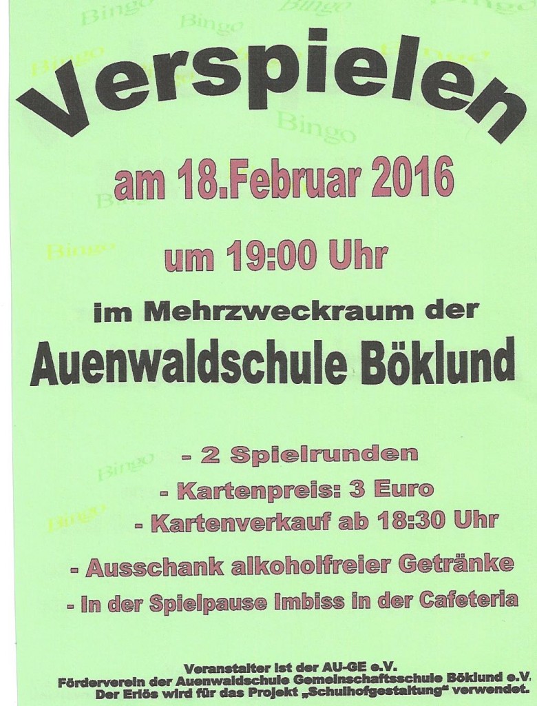 Am 18.Februar lädt unser Förderverein wieder zu einem Bingo – Abend im Mehrzweckraum der Auenwaldschule Böklund ein. Beginn ist um 19:00 Uhr, die Karten werden ab 18:30 verkauft.